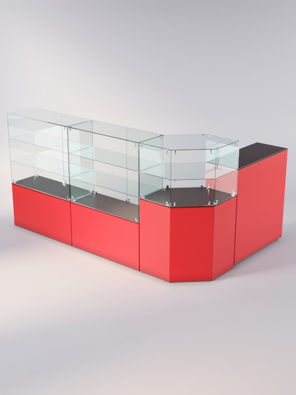 Данная модель представляет собой открытую систему из нескольких прилавков. Сюда входят прямоугольные прилавки с двумя полками, шестиугольный прилавок с полкой, а также закрытый выкатной прилавок.