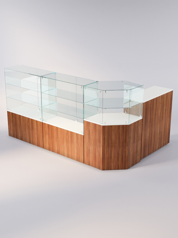 Данная модель представляет собой открытую систему из нескольких прилавков. Сюда входят прямоугольные прилавки с двумя полками, шестиугольный прилавок с полкой, а также закрытый выкатной прилавок.