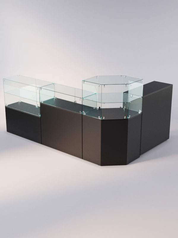 Данная модель представляет собой открытую систему из нескольких прилавков. Сюда входят прямоугольные прилавки с полкой и без полок, шестиугольный прилавок с полкой, а также закрытый выкатной прилавок.