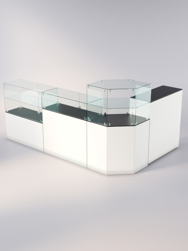 Данная модель представляет собой открытую систему из нескольких прилавков. Сюда входят прямоугольные прилавки с полкой и без полок, шестиугольный прилавок с полкой, а также закрытый выкатной прилавок.