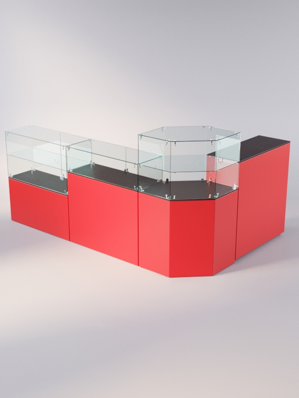 Данная модель представляет собой открытую систему из нескольких прилавков. Сюда входят прямоугольные прилавки с полкой и без полок, шестиугольный прилавок с полкой, а также закрытый выкатной прилавок.