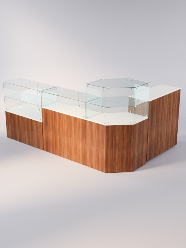 Данная модель представляет собой открытую систему из нескольких прилавков. Сюда входят прямоугольные прилавки с полкой и без полок, шестиугольный прилавок с полкой, а также закрытый выкатной прилавок.