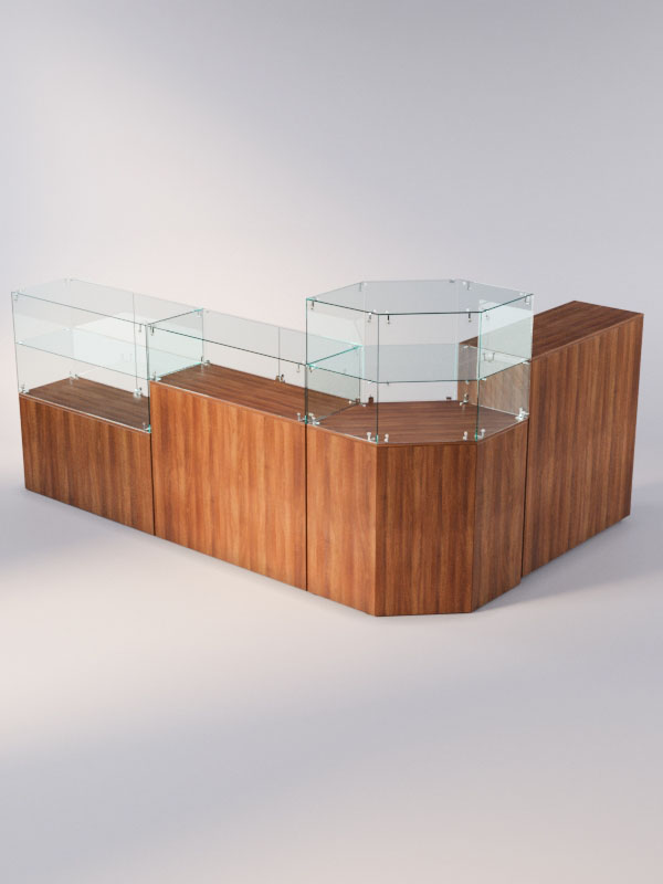 Данная модель представляет собой открытую систему из нескольких прилавков. Сюда входят прямоугольные прилавки с полкой и без полок, шестиугольный прилавок с полкой, а также закрытый выкатной прилавок.