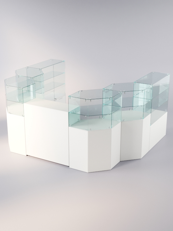 Данная модель представляет собой открытую систему из нескольких прилавков. Сюда входят прямоугольные прилавки с двумя полками, шестиугольные прилавки с полкой, а также закрытый выкатной прилавок.