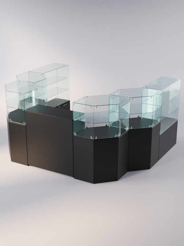 Данная модель представляет собой открытую систему из нескольких прилавков. Сюда входят прямоугольные прилавки с двумя полками, шестиугольные прилавки с полкой, а также закрытый выкатной прилавок.