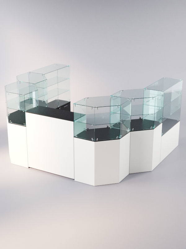 Данная модель представляет собой открытую систему из нескольких прилавков. Сюда входят прямоугольные прилавки с двумя полками, шестиугольные прилавки с полкой, а также закрытый выкатной прилавок.