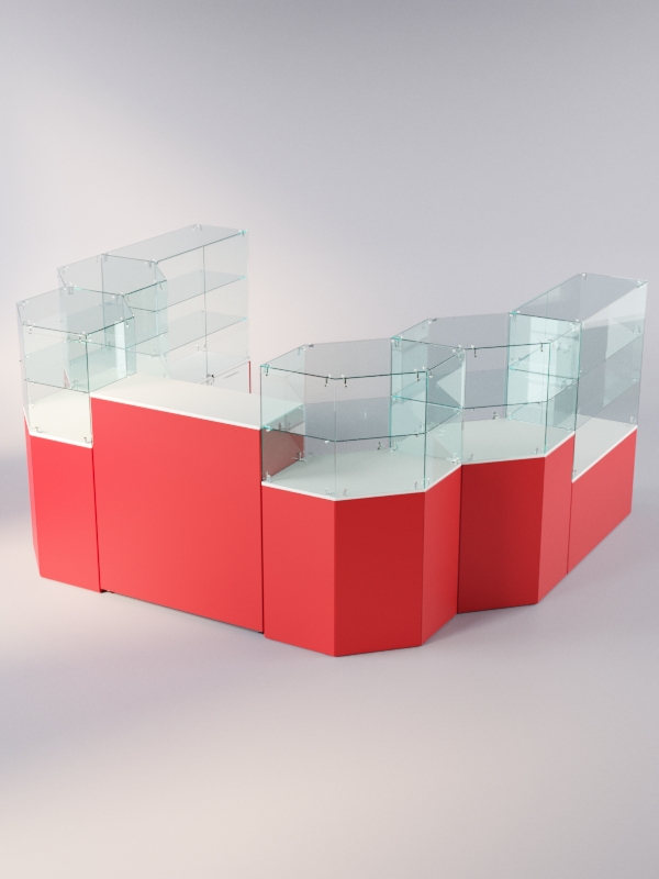 Данная модель представляет собой открытую систему из нескольких прилавков. Сюда входят прямоугольные прилавки с двумя полками, шестиугольные прилавки с полкой, а также закрытый выкатной прилавок.