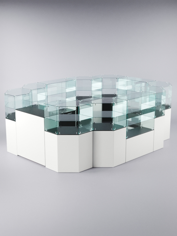 Данная модель представляет собой закрытую систему из нескольких прилавков. Сюда входят прилавки с витриной, содержащие разное количество полок, а также закрытый выкатной прилавок.
