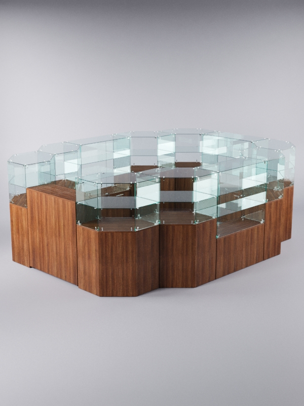 Данная модель представляет собой закрытую систему из нескольких прилавков. Сюда входят прилавки с витриной, содержащие разное количество полок, а также закрытый выкатной прилавок.