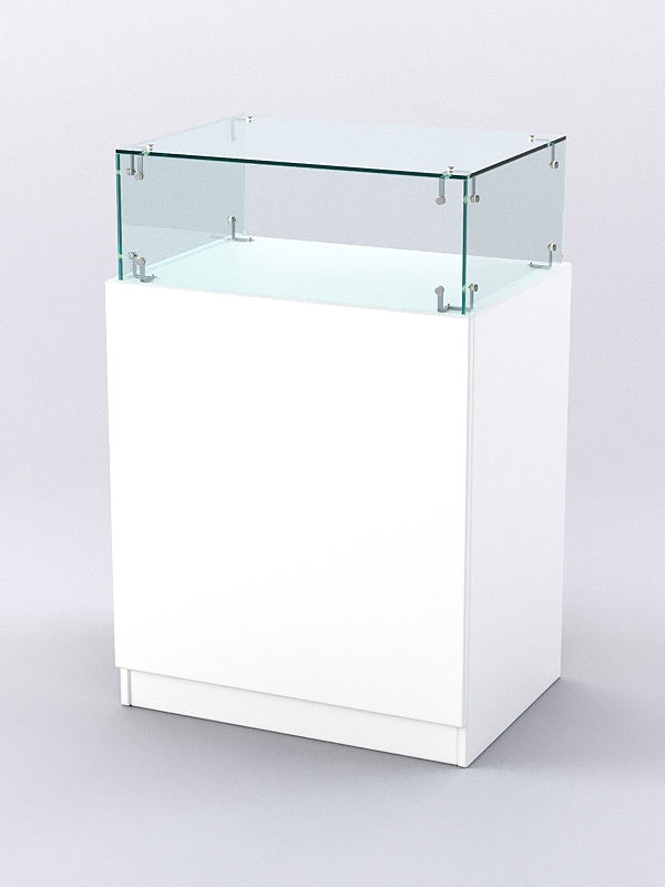 Каркас прилавка выполнен из ЛДСП. Корпус витрины — стеклянный.
