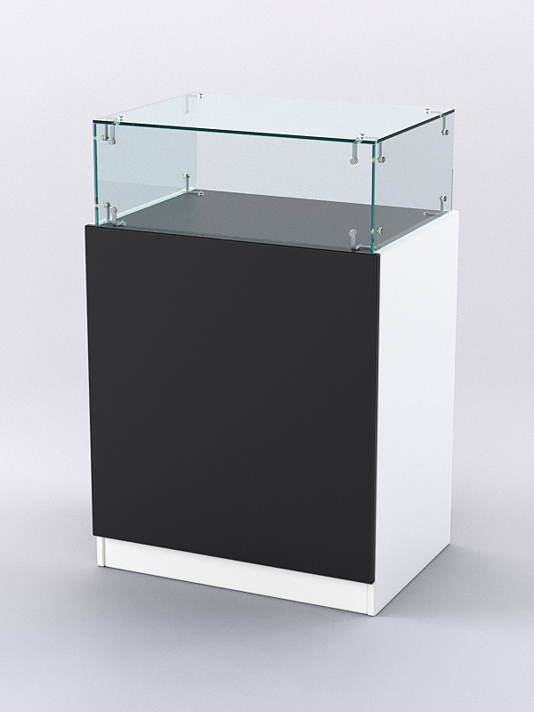 Каркас прилавка выполнен из ЛДСП. Корпус витрины — стеклянный.