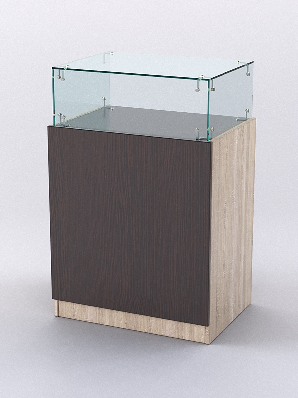 Каркас прилавка выполнен из ЛДСП. Корпус витрины — стеклянный.