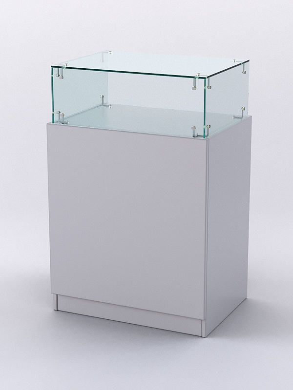 Каркас прилавка выполнен из ЛДСП. Корпус витрины — стеклянный.