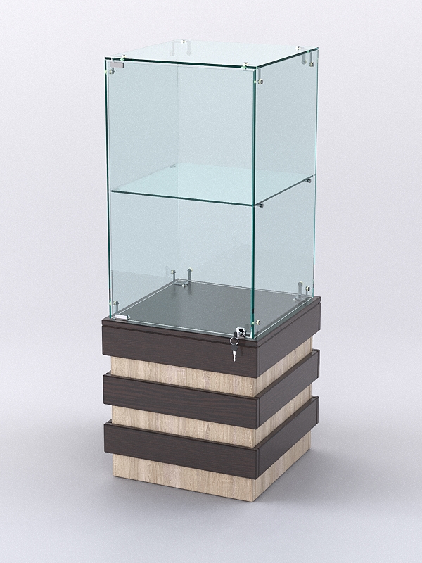 Каркас прилавка выполнен из ЛДСП. Корпус и полка витрины — стеклянные.