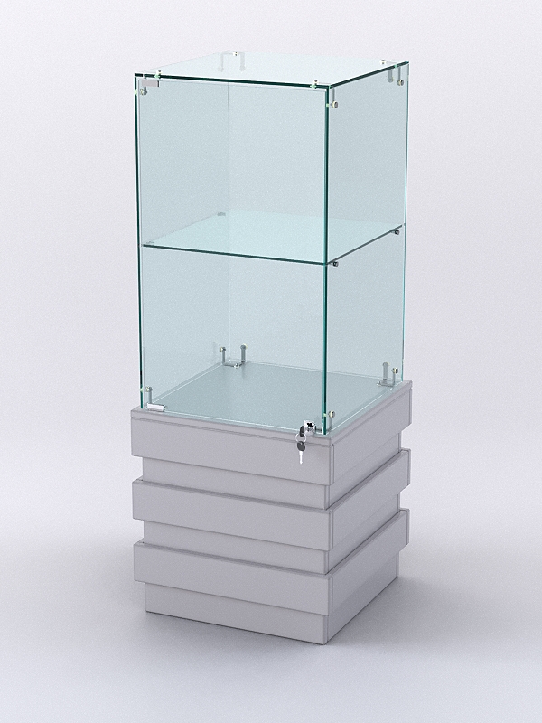 Каркас прилавка выполнен из ЛДСП. Корпус и полка витрины — стеклянные.