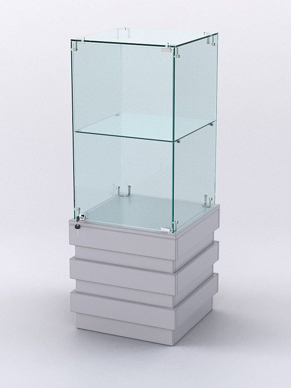 Каркас прилавка выполнен из ЛДСП. Корпус и полка витрины — стеклянные.