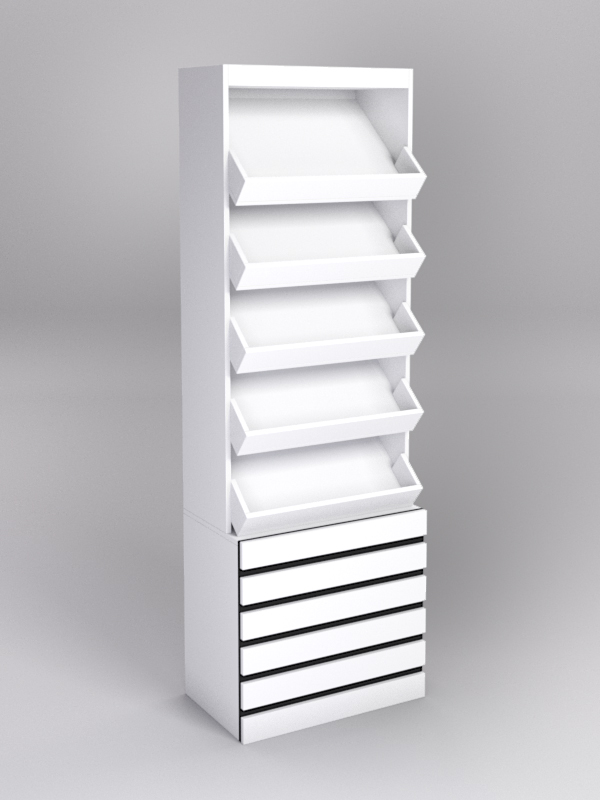 Стеллаж подойдет для выкладки весовой продукции: конфет, печенья, орехов, сухофруктов. Конструкция содержит пять наклонных полок с ограничителями. В основании стеллажа находится подиум.