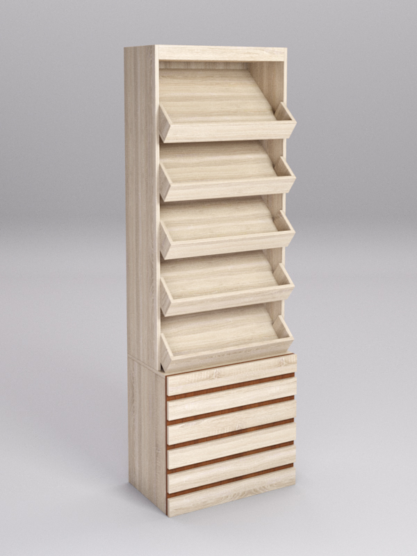 Стеллаж подойдет для выкладки весовой продукции: конфет, печенья, орехов, сухофруктов. Конструкция содержит пять наклонных полок с ограничителями. В основании стеллажа находится подиум.