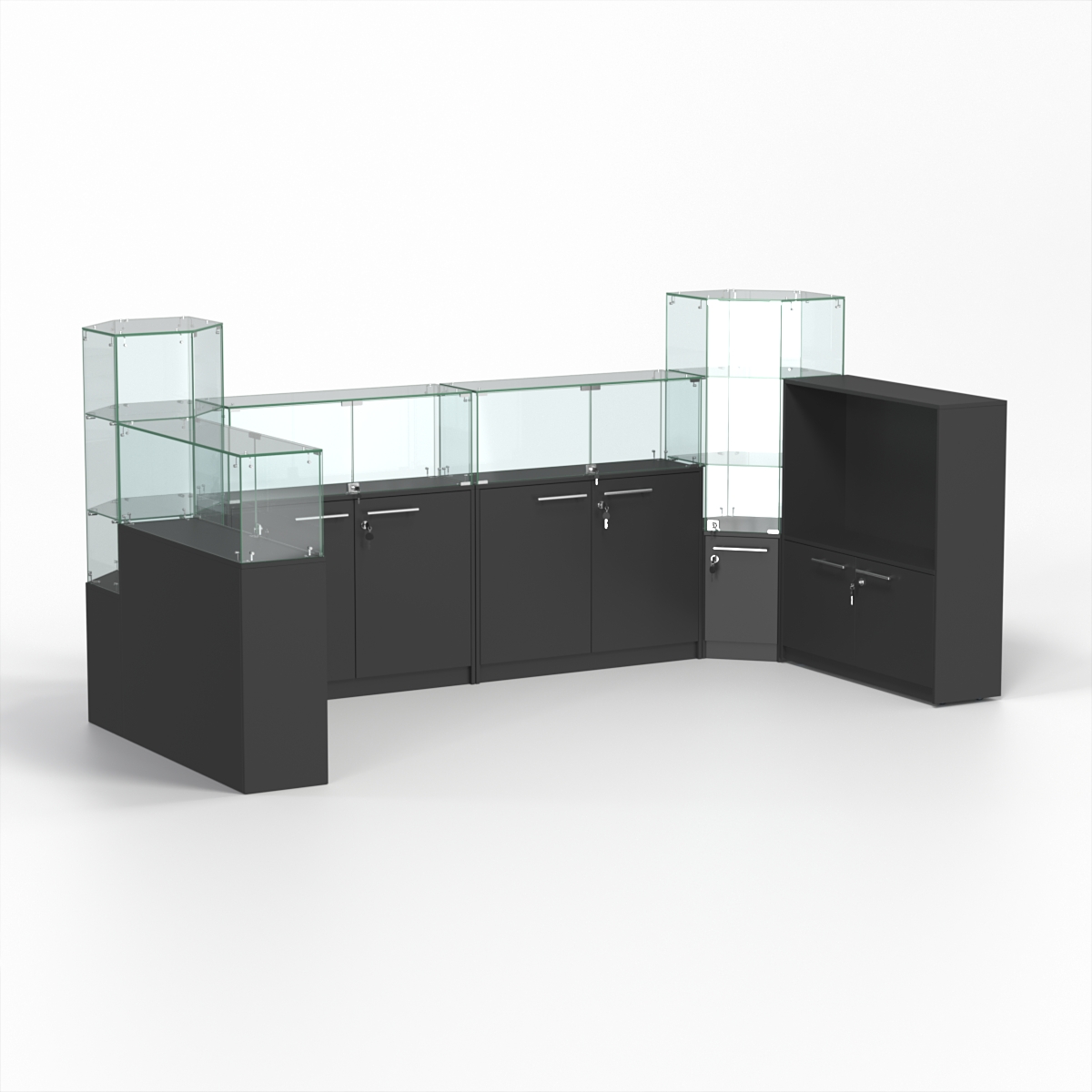 Комплект включает три прямоугольных прилавка, два шестиугольных и один закрытый прилавок.
