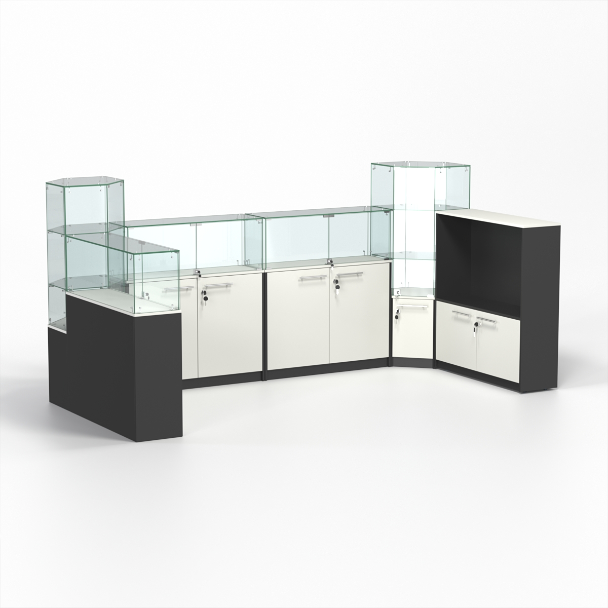 Каркас прилавков выполнен из ЛДСП. Витрины и полки — стеклянные. При равномерном распределении предметов нагрузка на полку составляет 5-7кг.
