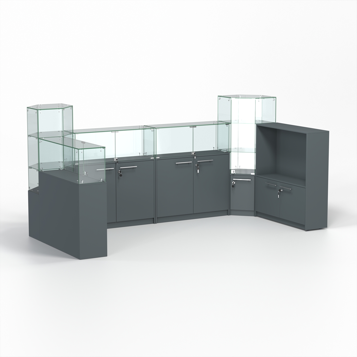 Комплект включает три прямоугольных прилавка, два шестиугольных и один закрытый прилавок.