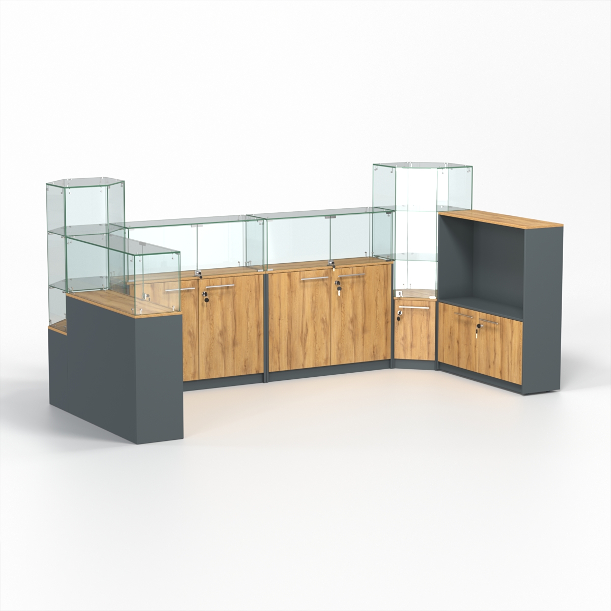 Комплект включает три прямоугольных прилавка, два шестиугольных и один закрытый прилавок.