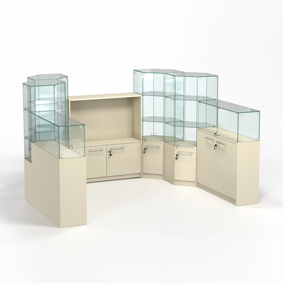 Комплект включает два прямоугольных прилавка, четыре шестиугольных и один закрытый прилавок.