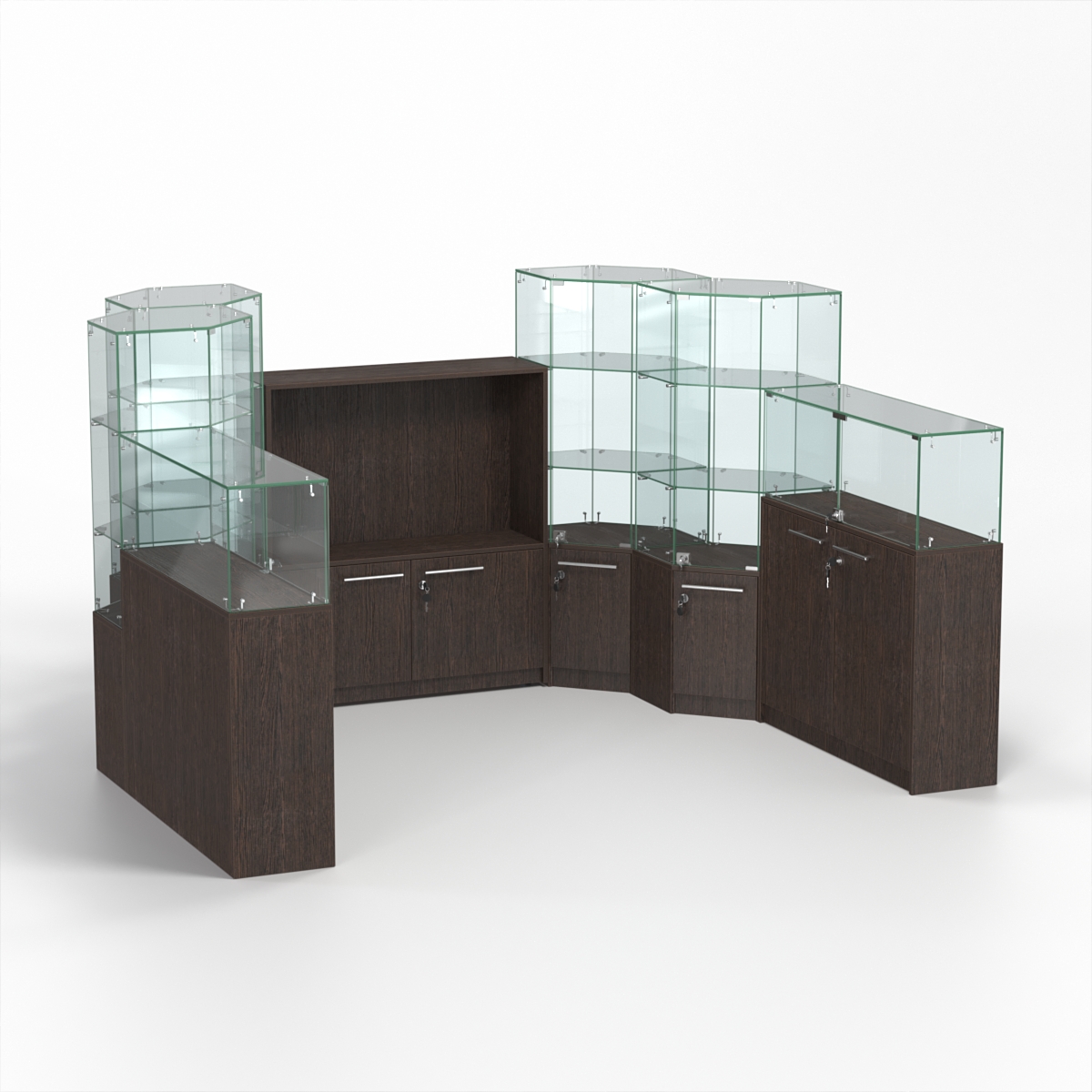 Комплект включает два прямоугольных прилавка, четыре шестиугольных и один закрытый прилавок.