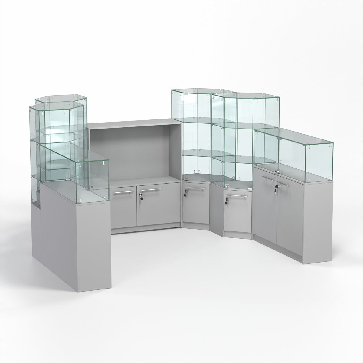 Комплект включает два прямоугольных прилавка, четыре шестиугольных и один закрытый прилавок.
