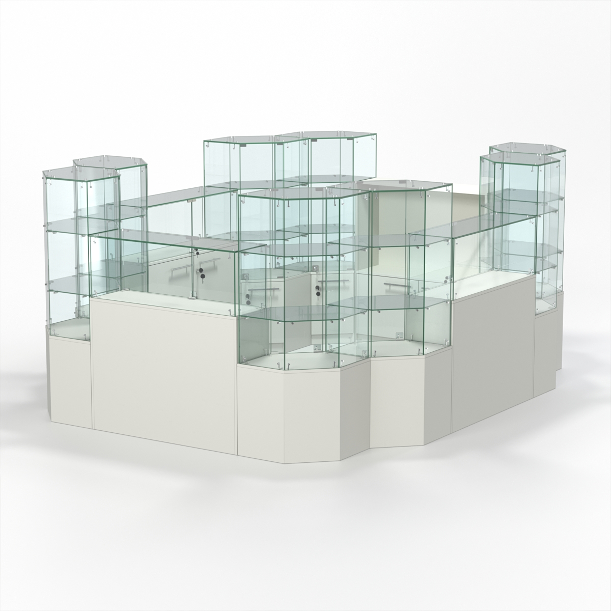 Комплект включает три прямоугольных прилавка, восемь шестиугольных прилавков, а также закрытый прилавок.