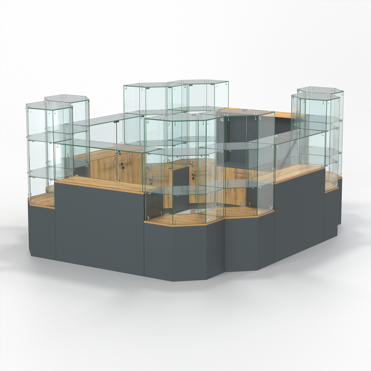 Комплект включает три прямоугольных прилавка, восемь шестиугольных прилавков, а также закрытый прилавок.