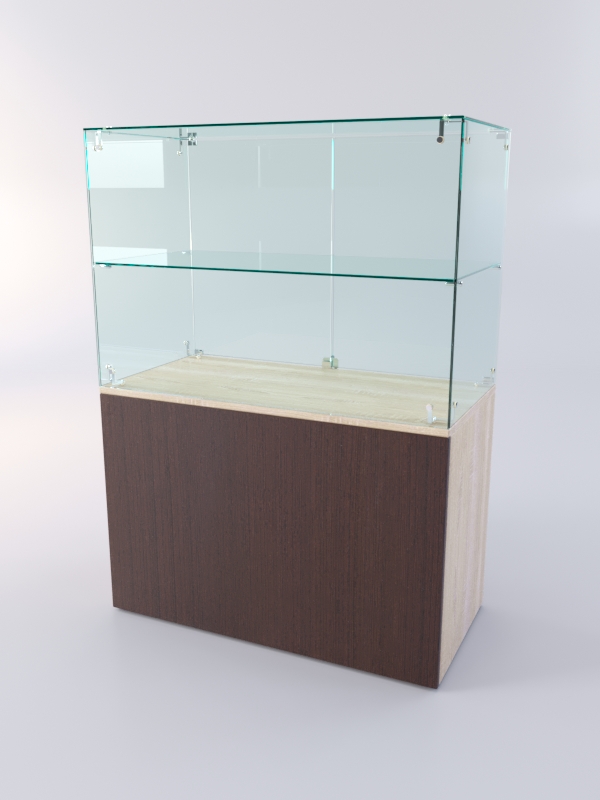 Накопитель изготовлен из ЛДСП, корпус витрины — стеклянный.