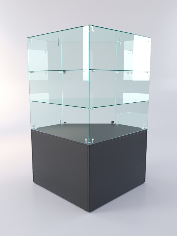 Накопитель изготовлен из ЛДСП, корпус и полки витрины — стеклянные. П