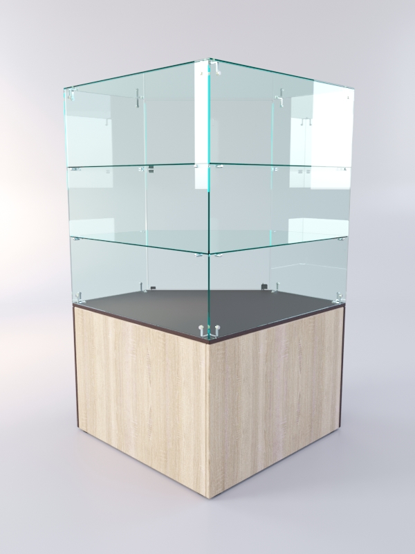 Накопитель изготовлен из ЛДСП, корпус и полки витрины — стеклянные. П