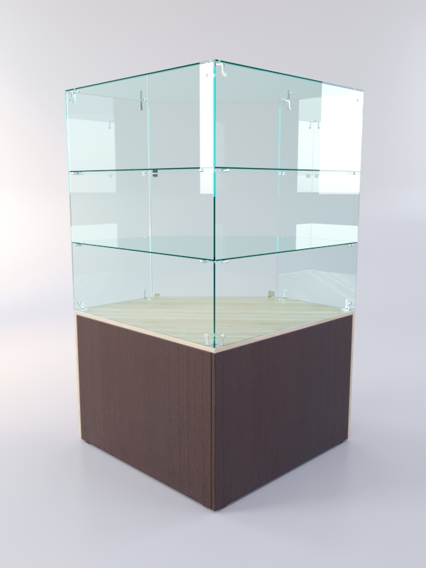 Накопитель изготовлен из ЛДСП, корпус и полки витрины — стеклянные. П