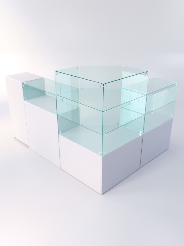 Конструкция островка включает два прямоугольных прилавка, пятиугольный и закрытый прилавки.