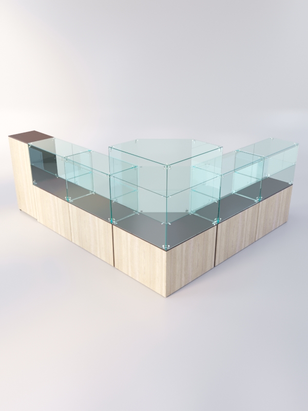 Каркас прилавков изготовлен из ЛДСП, корпус и полки витрин — стеклянные.