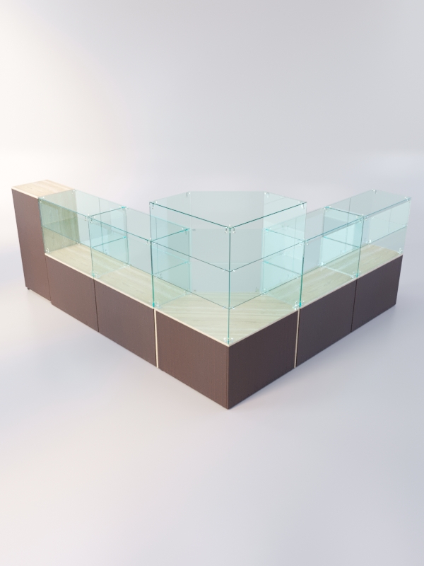 Конструкция островка включает четыре прямоугольных прилавка, пятиугольный и закрытый прилавки.