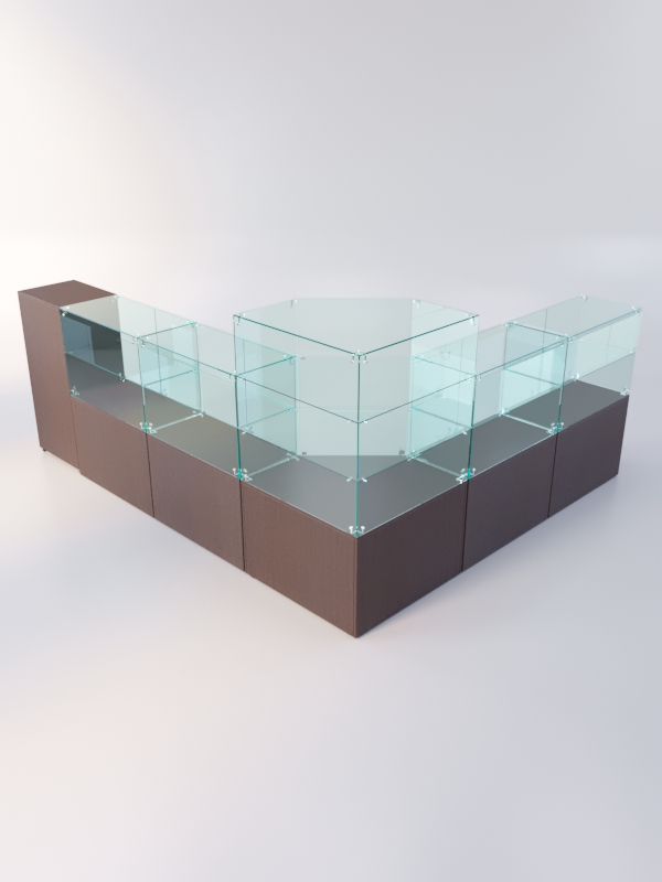 Каркас прилавков изготовлен из ЛДСП, корпус и полки витрин — стеклянные.