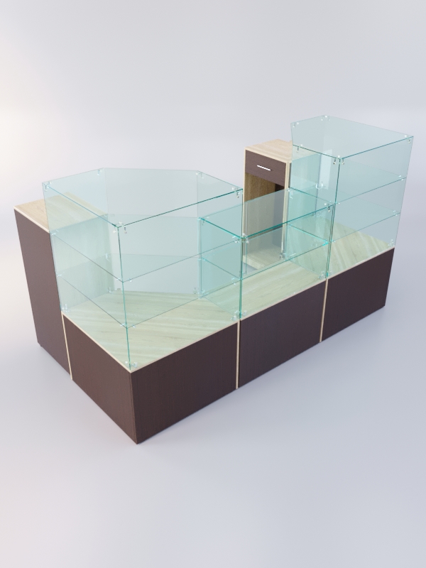Каркас прилавков изготовлен из ЛДСП, корпус и полки витрин — стеклянные.