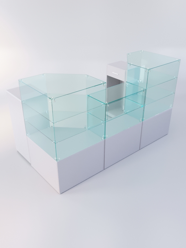 Модульную систему из разных прилавков с дверцами можно собрать так, как будет удобно вам. Есть тумбы для хранения, стеллажи со стеклянными полками и кассовая зона.