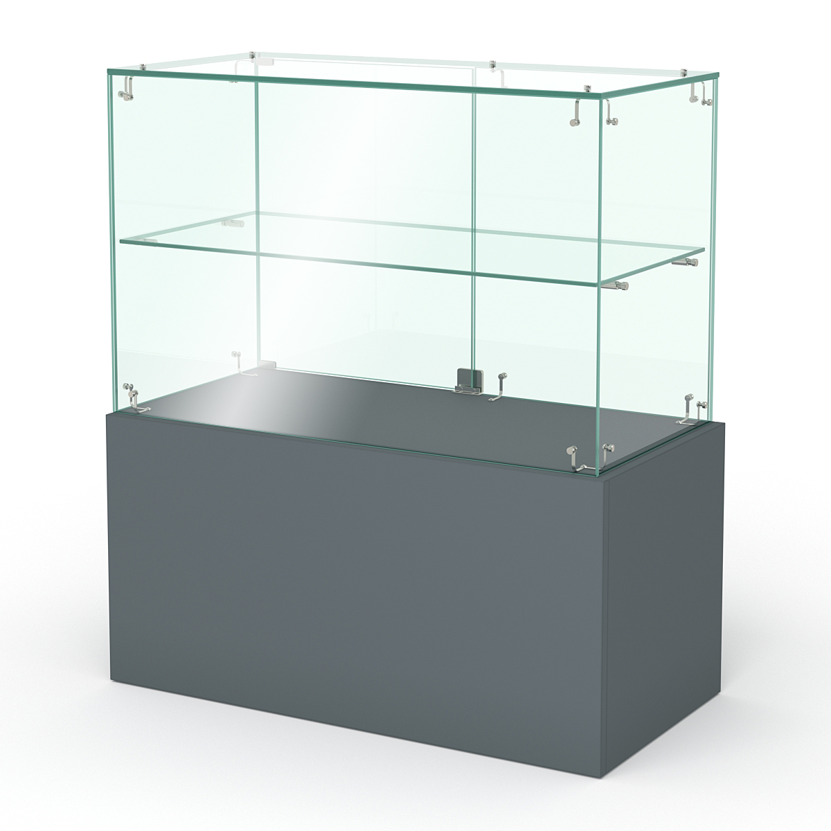 Накопитель изготовлен из ЛДСП, корпус витрины — стеклянный.