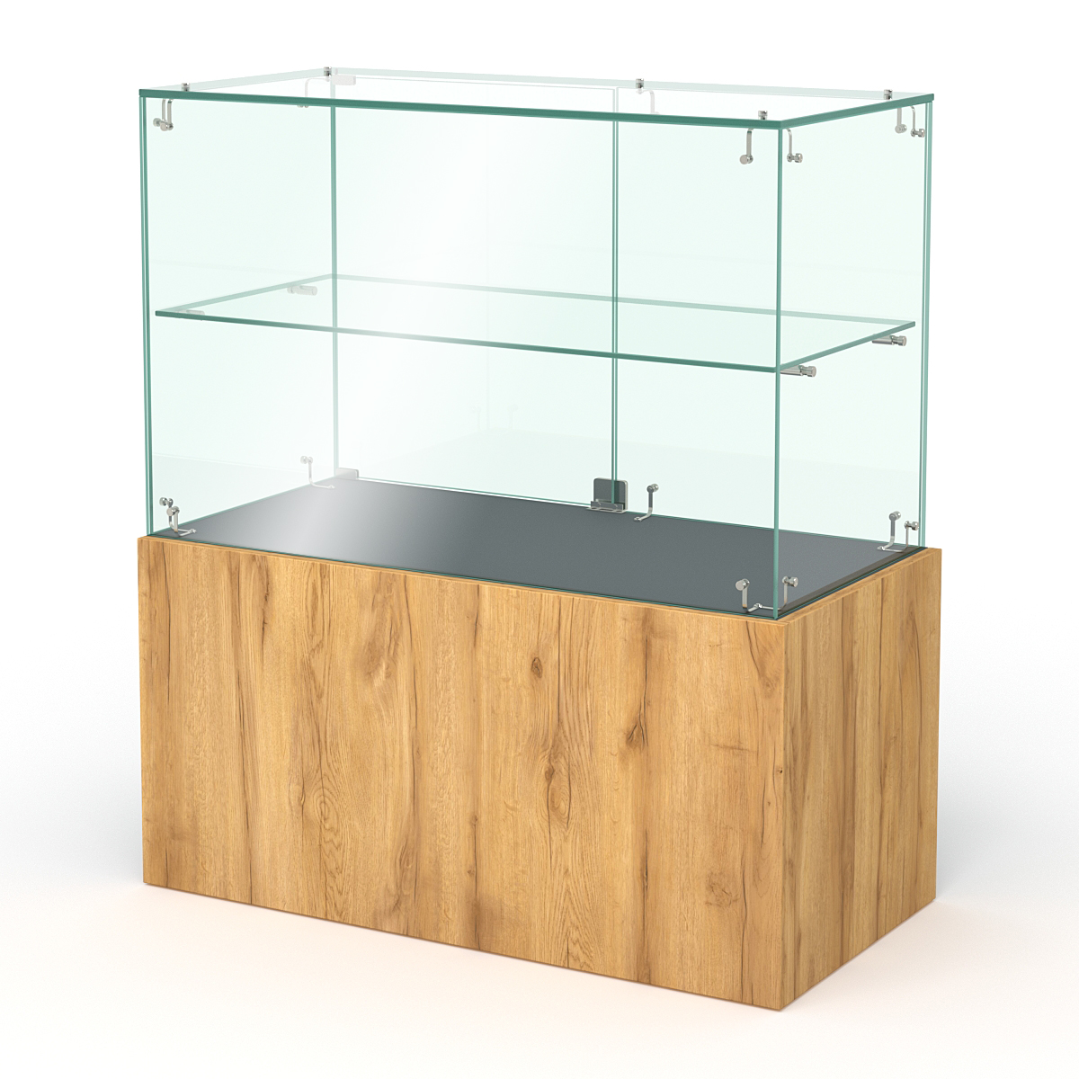 Накопитель изготовлен из ЛДСП, корпус витрины — стеклянный.