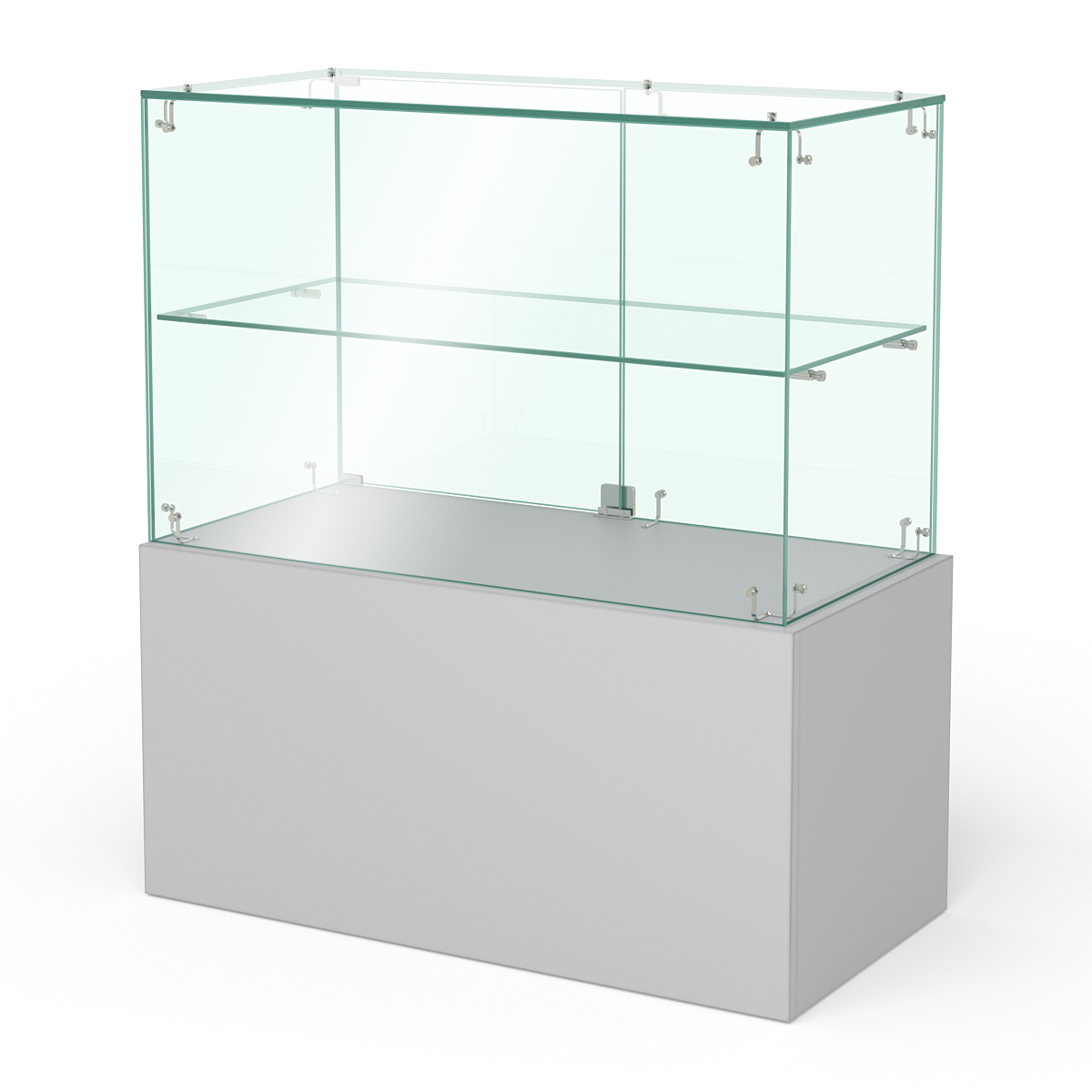 Накопитель изготовлен из ЛДСП, корпус витрины — стеклянный.