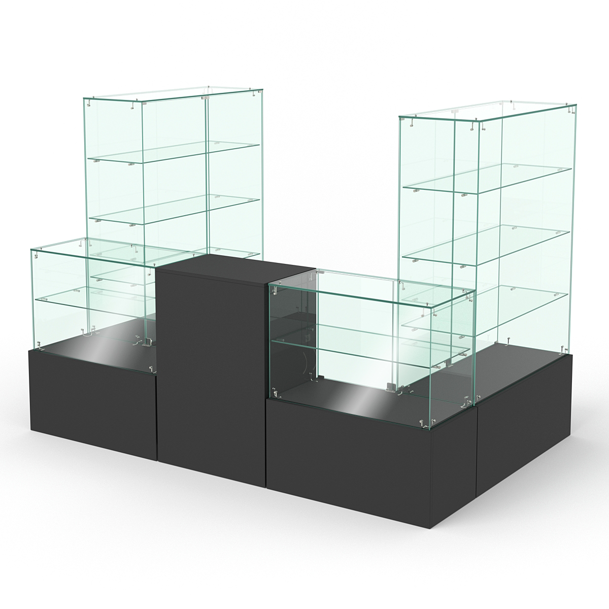 Каркас моделей выполнен из ЛДСП. Корпус и полки витрин — стеклянные.