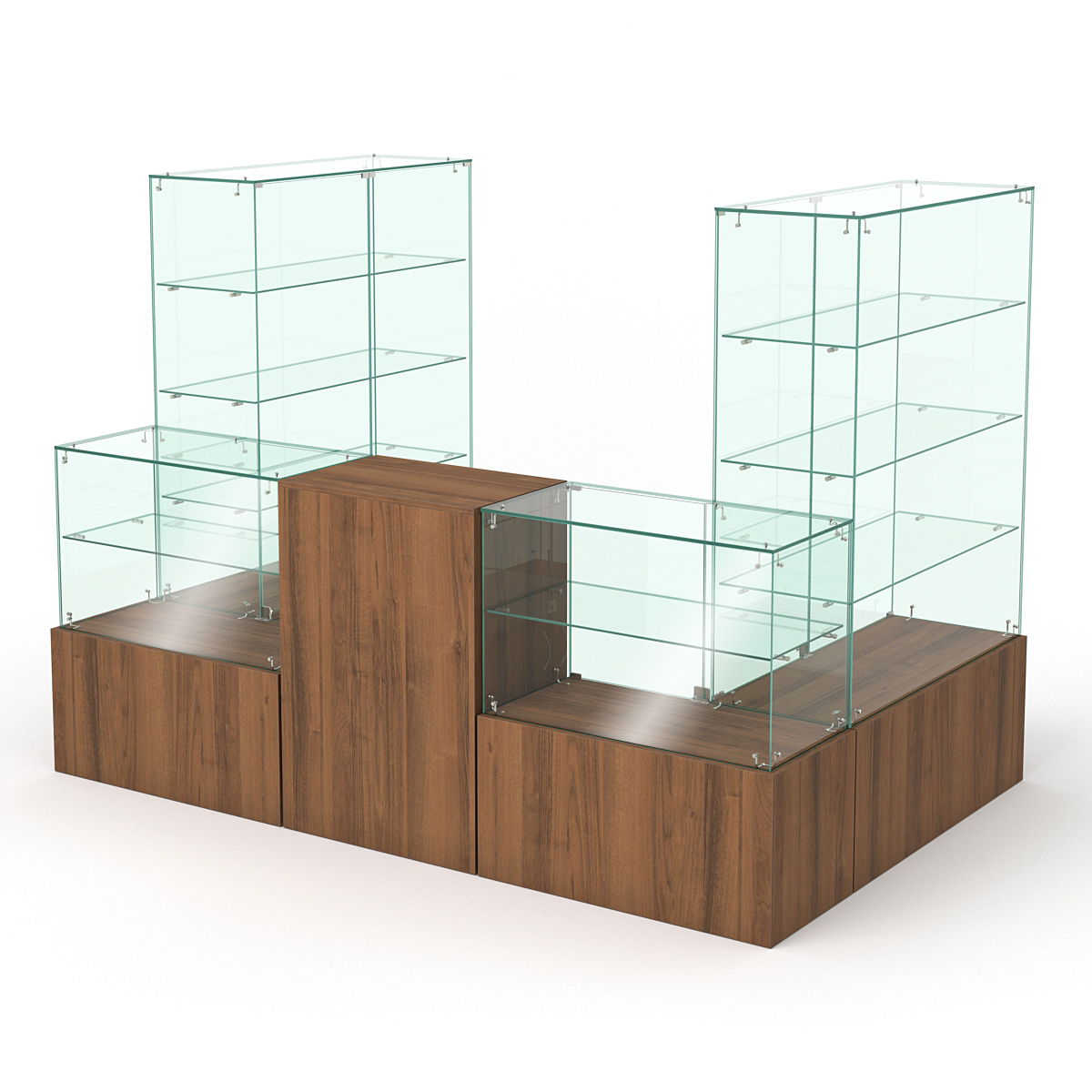 Торговый островок включает два прилавка с витринами, закрытый прилавок и две витрины.