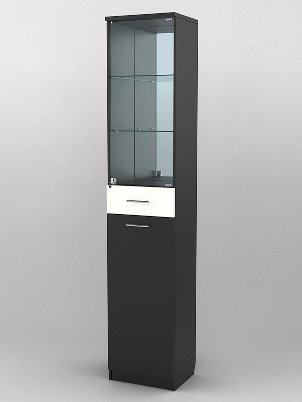 Конструкция представляет собой узкий шкаф, состоящий из двух отделений. Верхнее отделение содержит две стеклянные полки. Передняя и задняя стенки также стеклянные. При равномерном распределении предметов нагрузка на полку составляет 5-7кг. Между отделениями расположен выдвижной ящик. Нижнее отделение представляет собой закрытый шкаф.