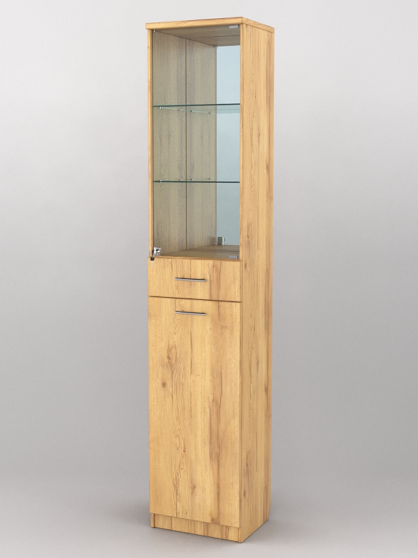 Конструкция представляет собой узкий шкаф, состоящий из двух отделений. Верхнее отделение содержит две стеклянные полки. Передняя и задняя стенки также стеклянные. При равномерном распределении предметов нагрузка на полку составляет 5-7кг. Между отделениями расположен выдвижной ящик. Нижнее отделение представляет собой закрытый шкаф.