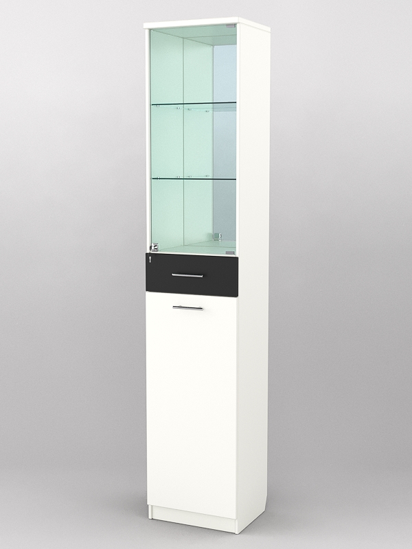 Конструкция представляет собой узкий шкаф, состоящий из двух отделений. Верхнее отделение содержит две стеклянные полки. Передняя и задняя стенки также стеклянные. При равномерном распределении предметов нагрузка на полку составляет 5-7кг. Между отделениями расположен выдвижной ящик. Нижнее отделение представляет собой закрытый шкаф.