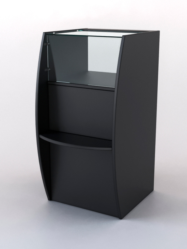 Прилавок предназначен для демонстрации товара покупателю в магазине или островке по продаже сувениров, бижутерии, косметики. На фасаде расположена витрина для выкладки товара и полка для сумок. Внутри прилавка — две полки для хранения ассортимента. С внутренней стороны конструкция полностью открытая. Каркас выполнен из ЛДСП. Передняя стенка и крышка витрины — стеклянные. Цвет представлен в семи стандартных вариантах; другие цвета подбираются в палитре на заказ.